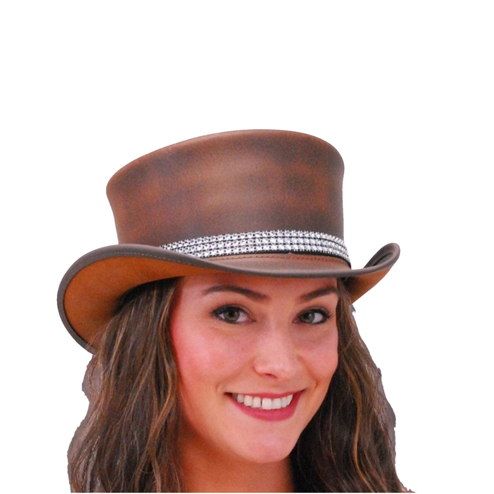This handcrafted leather top hat features a crystal band, blending Gothic and Steampunk styles. Perfect for Halloween or events, it’s bold, stylish, and durable.