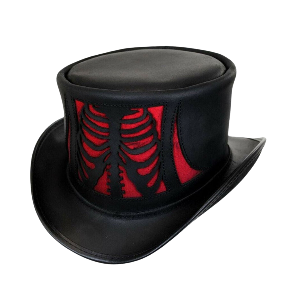 The Scary Skull Style Black and Red Contrast Top Hat blends bold colors and a skull design for a unique, edgy look. Handcrafted with 100% pure leather and adjustable fit.