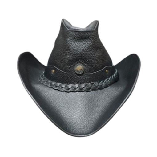 This handcrafted black cowboy hat, made from 100% genuine leather, offers a rugged, stylish look perfect for any occasion. Durable and timeless design.