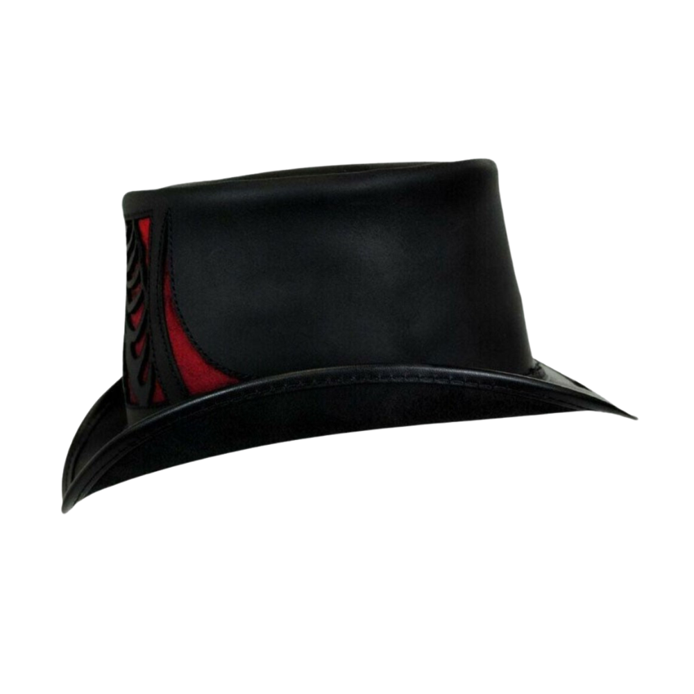 The Scary Skull Style Black and Red Contrast Top Hat blends bold colors and a skull design for a unique, edgy look. Handcrafted with 100% pure leather and adjustable fit.