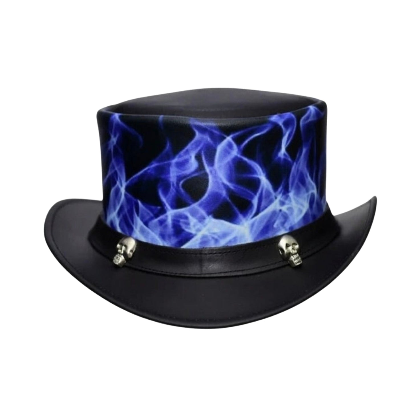 Add edgy flair to your look with this handmade leather top hat featuring a skull and fire band, perfect for bikers and Steampunk fans. 100% genuine leather, durable, and stylish.