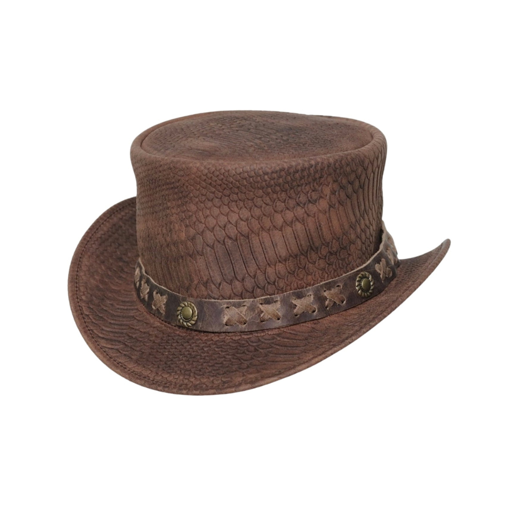 The Handmade Cobra Embossed Leather Steampunk Hat is crafted from premium brown leather, featuring a striking cobra design and a Gothic steampunk aesthetic.