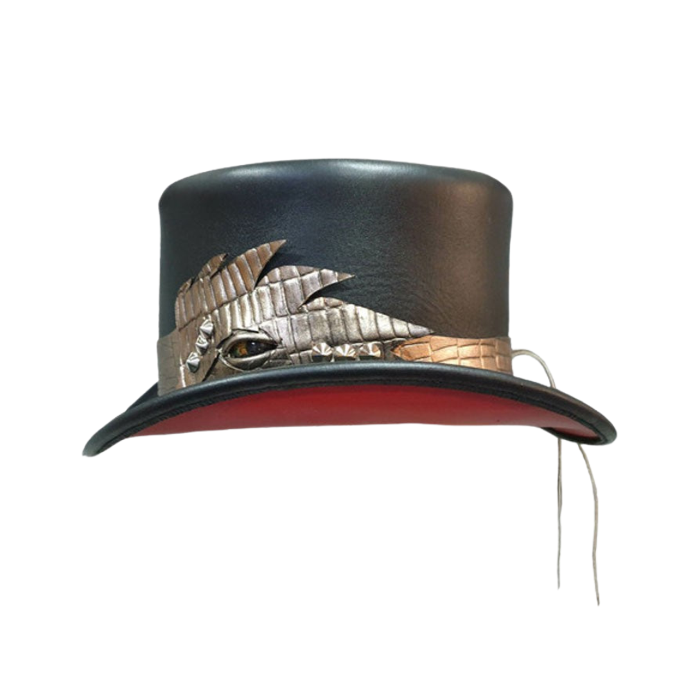 A stylish Steampunk Mad Hatter top hat with a crocodile eye band, crafted from laminated leather for a vintage charm with UV protection and premium craftsmanship.