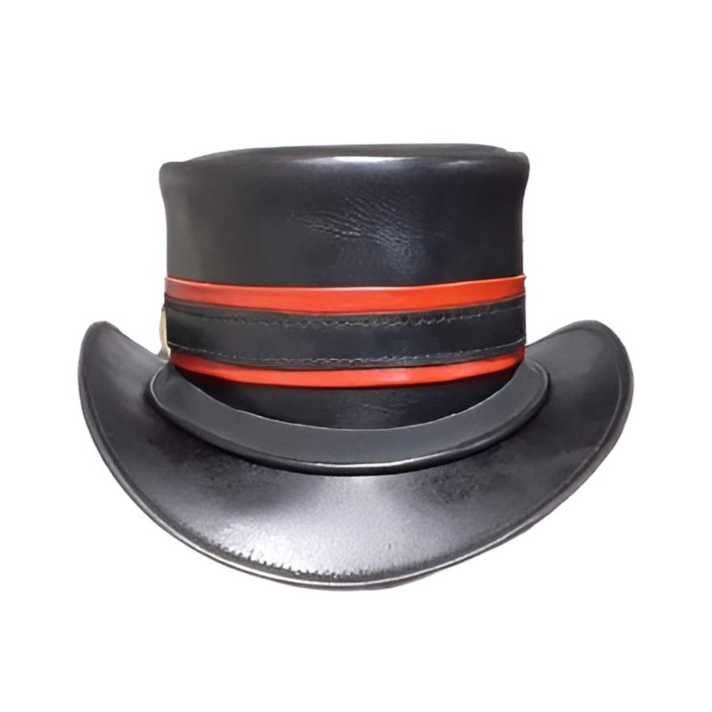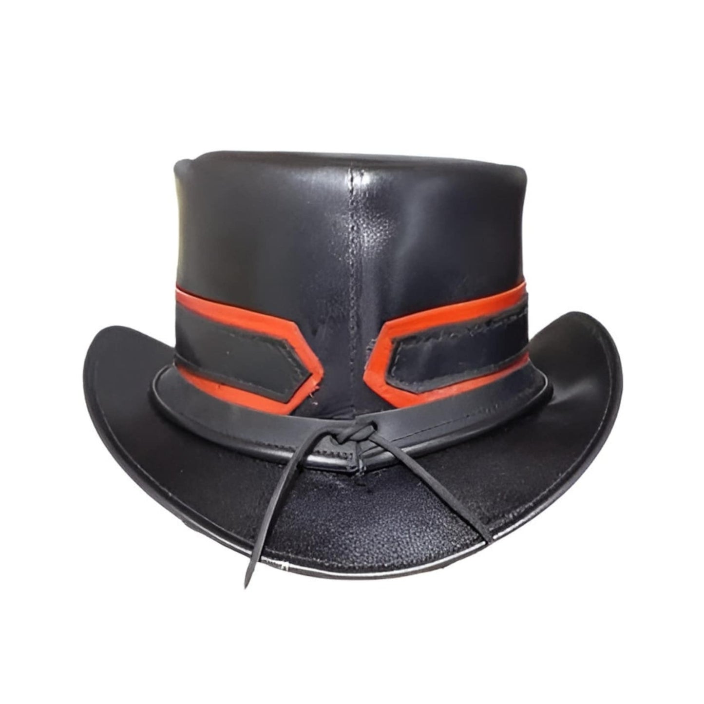 The Rocker Black Leather Top Hat is a bold, Gothic-inspired accessory made from 100% genuine leather. Handcrafted with a strap-style band for a unique edge.