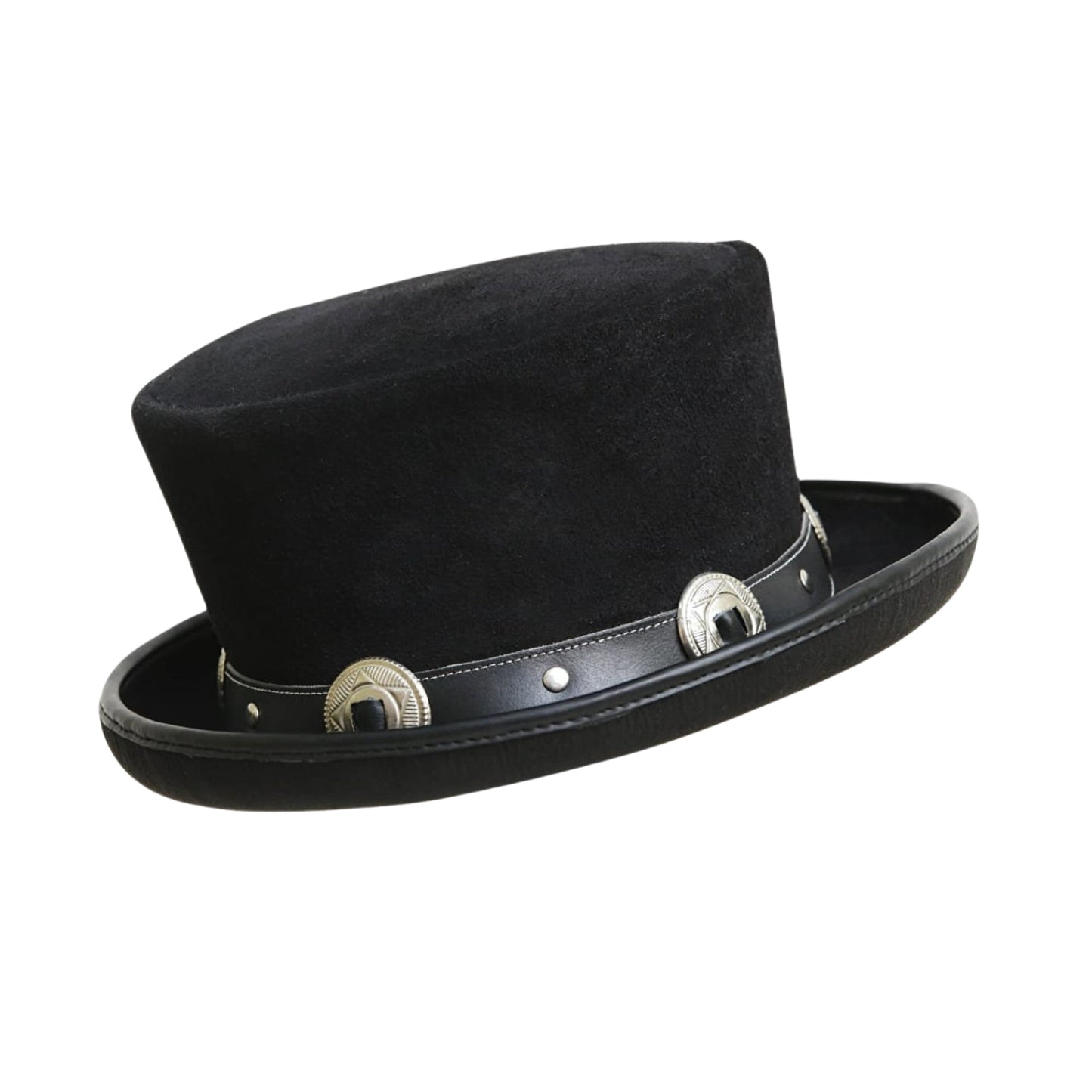 The Rocker Black Suede Leather Top Hat blends Gothic and Steampunk styles, featuring a concho-style band and 100% pure leather for a bold, unique look.