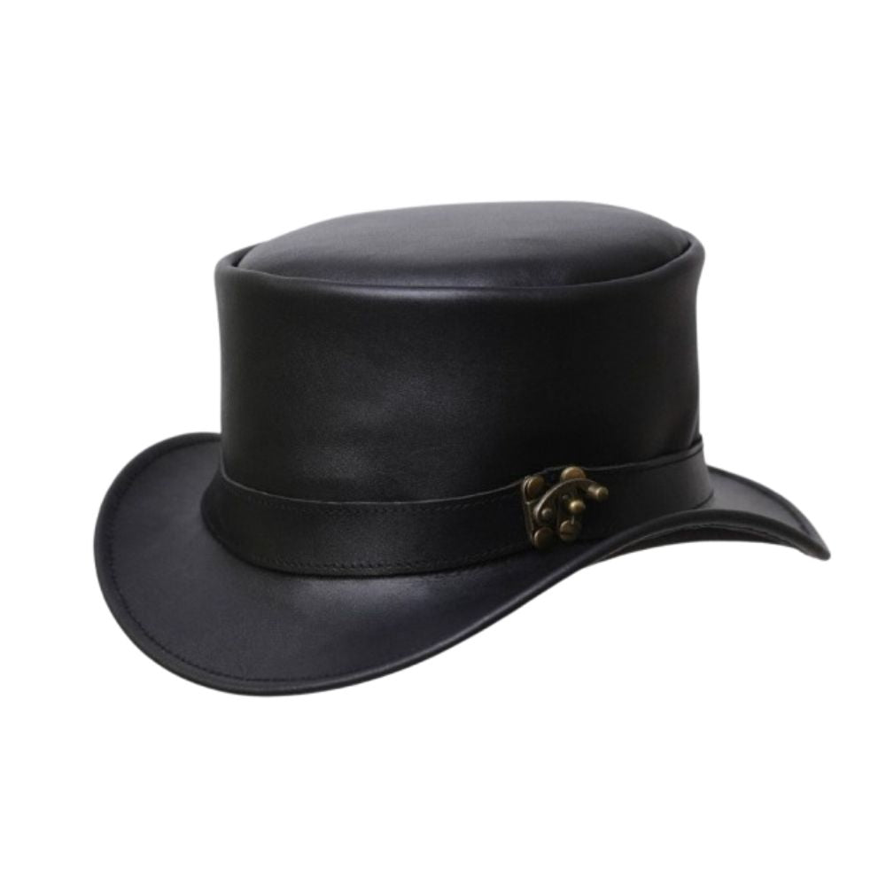 Handcrafted from genuine black leather, this top hat features a sleek side lock band and Gothic-inspired design. Durable, stylish, and perfect for Steampunk flair.