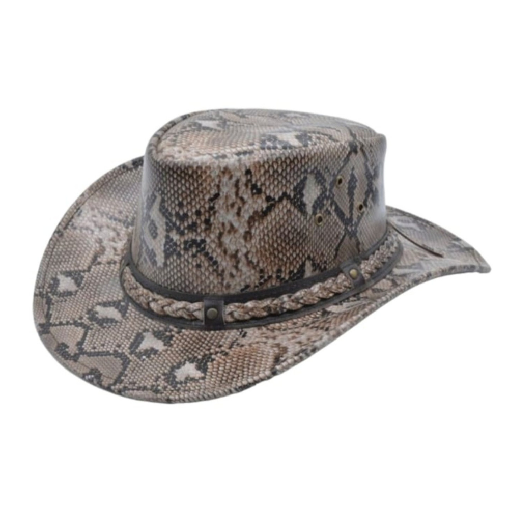 This handcrafted leather cowboy hat, made from real cowhide leather, features a bold snake print design. Durable, stylish, and comfortable for all-day wear.